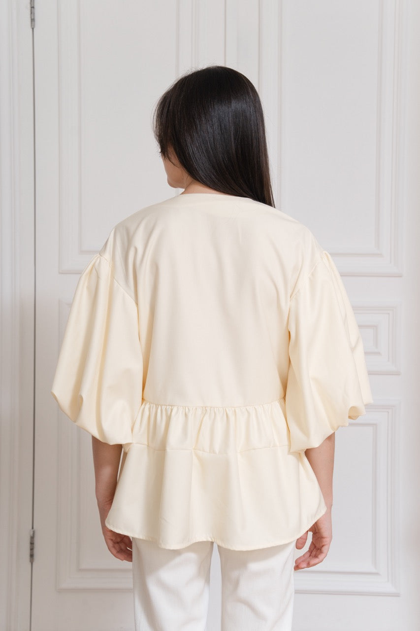 A modern take on everyday elegance, this Paloma Puff-Sleeve Top is designed with voluminous sleeves that add structure and charm. Featuring a clean round neckline and a front zipper closure, the silhouette is balanced with a gathered peplum detail at the waist for subtle definition.